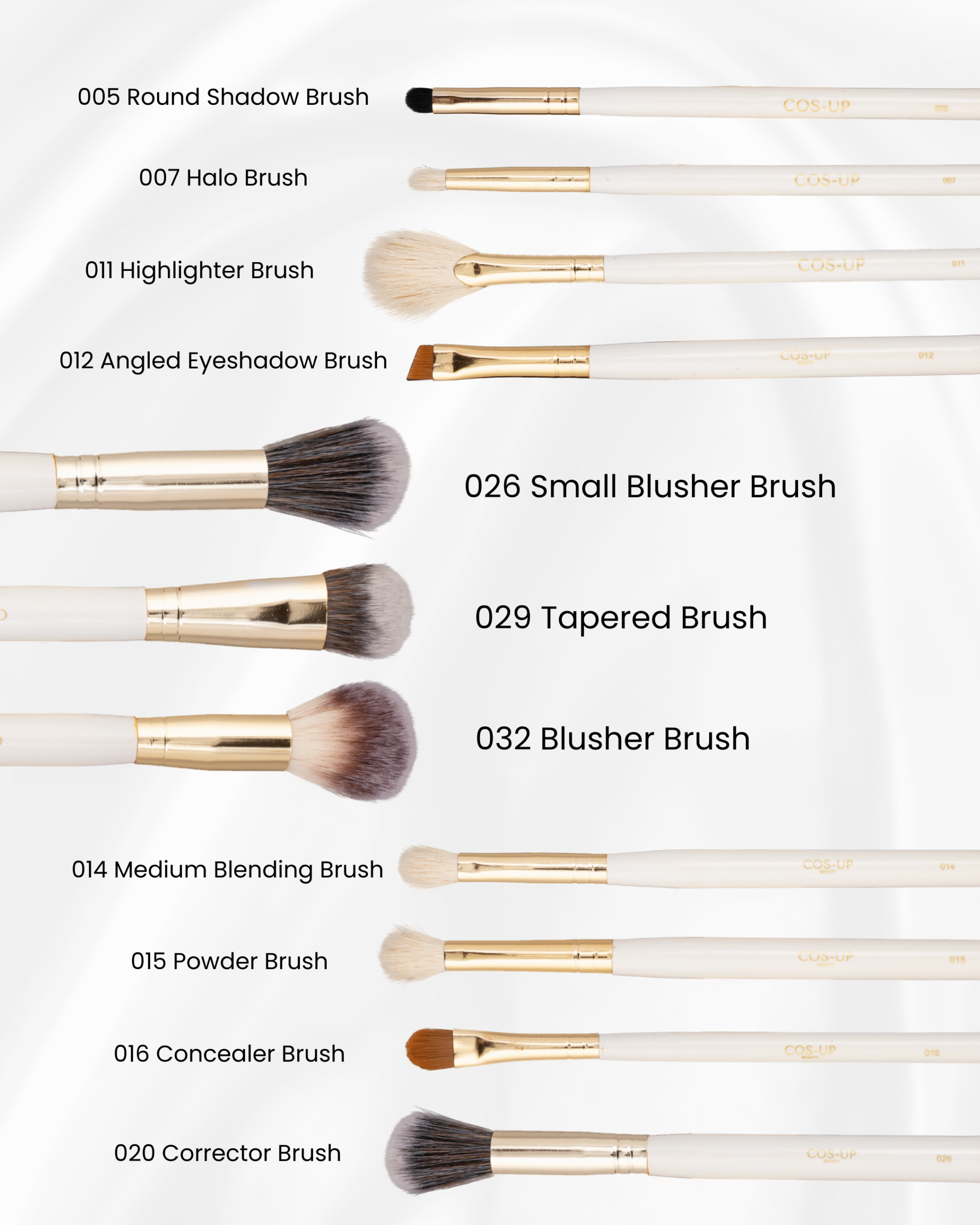 A complete professional eye brush set with eyeliner, eyebrow, shading, blending, concealer & detail brushes.
